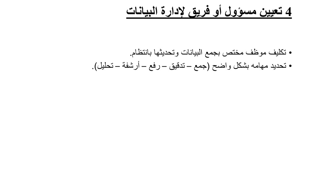 23. 4 تعيين مسؤول أو فريق لإدارة البيانات • تكليف موظف مختص بجمع البيانات وتحديثها بانتظام. • تحديد مهامه بشكل واضح (جمع – تدقيق – رفع – أرشفة – تحليل).