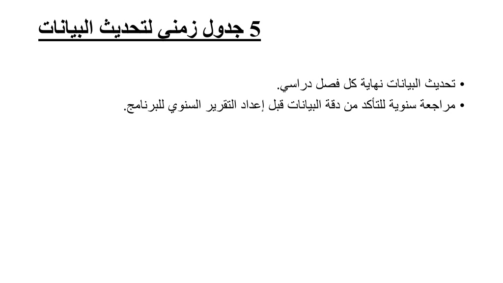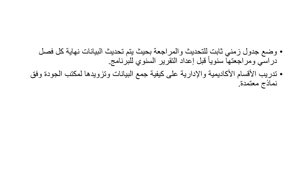 36. وضع جدول زمني ثابت للتحديث والمراجعة بحيث يتم تحديث البيانات نهاية كل فصل دراسي ومراجعتها سنوياً قبل إعداد التقرير السنوي للبرنامج. • تدريب الأقسام الأكاديمية والإدارية على كيفية جمع البيانات وتزويدها لمكتب الجودة وفق نماذج معتمدة.