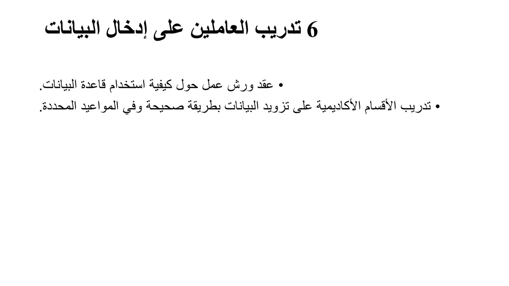 25. 6 تدريب العاملين على إدخال البيانات • عقد ورش عمل حول كيفية استخدام قاعدة البيانات. • تدريب الأقسام الأكاديمية على تزويد البيانات بطريقة صحيحة وفي المواعيد المحددة.