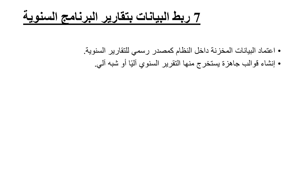 26. 7 ربط البيانات بتقارير البرنامج السنوية • اعتماد البيانات المخزنة داخل النظام كمصدر رسمي للتقارير السنوية. • إنشاء قوالب جاهزة يستخرج منها التقرير السنوي آليًا أو شبه آلي.