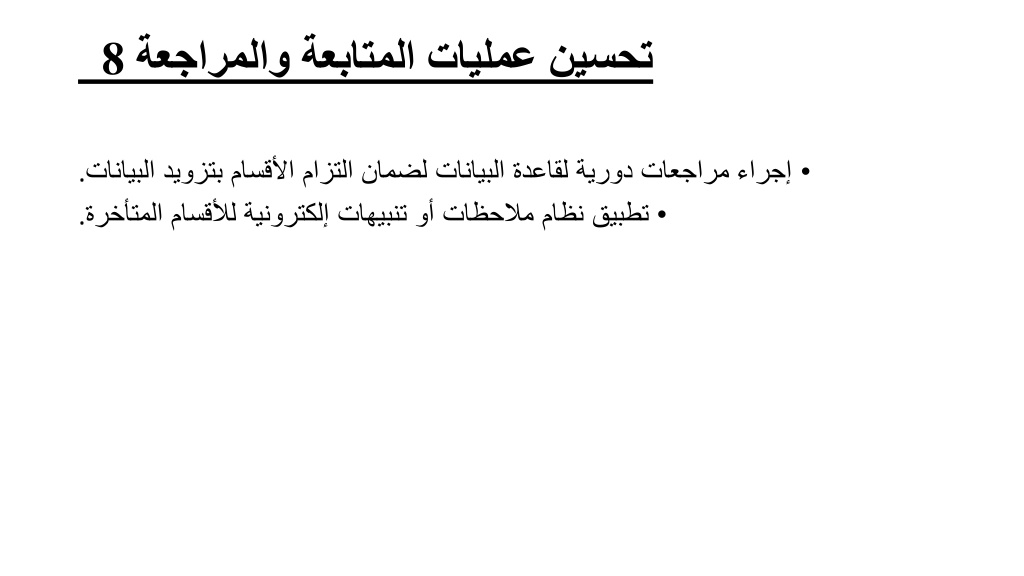27. تحسين عمليات المتابعة والمراجعة 8 • إجراء مراجعات دورية لقاعدة البيانات لضمان التزام الأقسام بتزويد البيانات. • تطبيق نظام ملاحظات أو تنبيهات إلكترونية للأقسام المتأخرة.