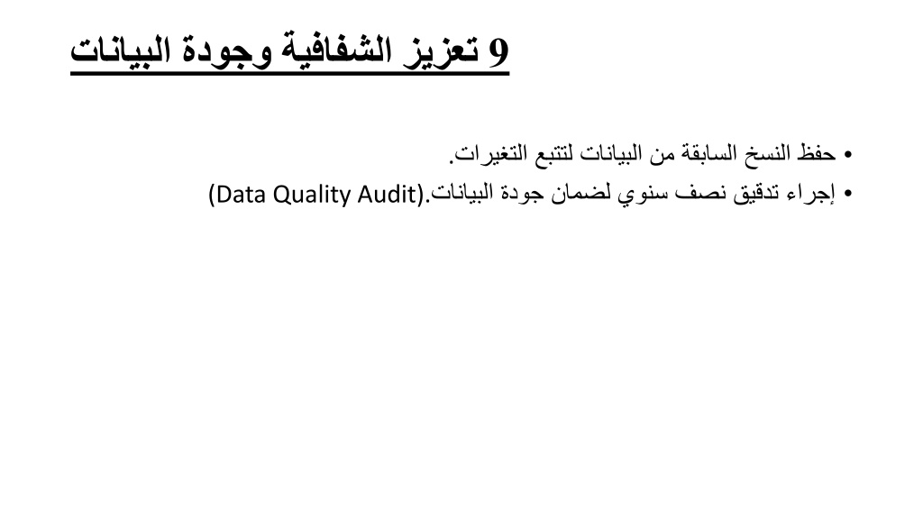 28. 9 تعزيز الشفافية وجودة البيانات • حفظ النسخ السابقة من البيانات لتتبع التغيرات. • إجراء تدقيق نصف سنوي لضمان جودة البيانات (Data Quality Audit).