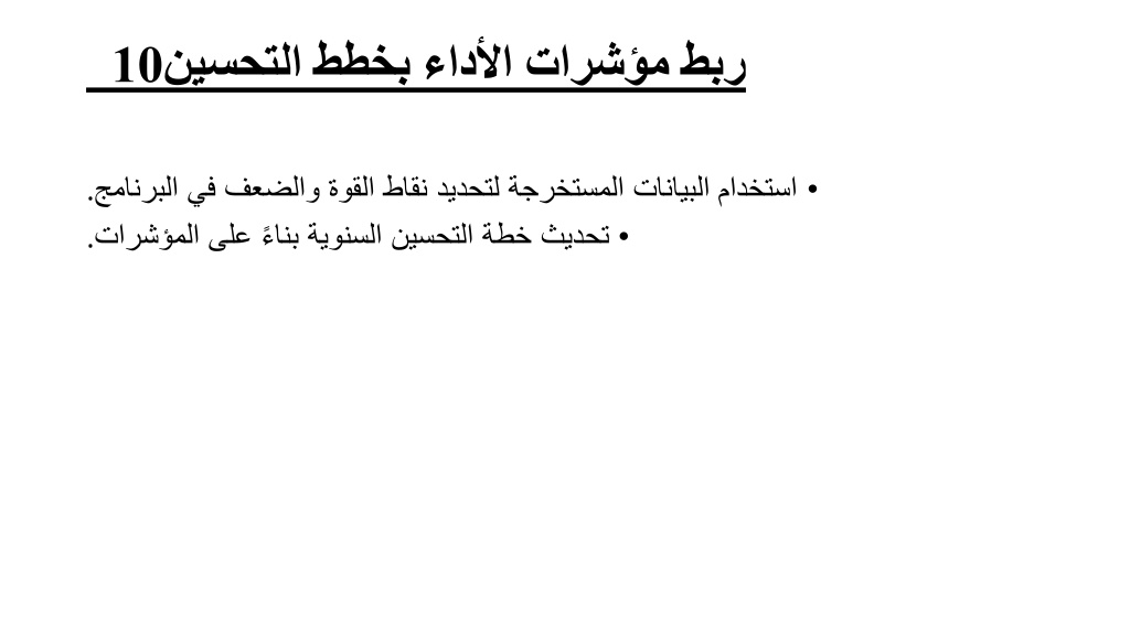 29. ربط مؤشرات الأداء بخطط التحسين10 • استخدام البيانات المستخرجة لتحديد نقاط القوة والضعف في البرنامج. • تحديث خطة التحسين السنوية بناءً على المؤشرات.