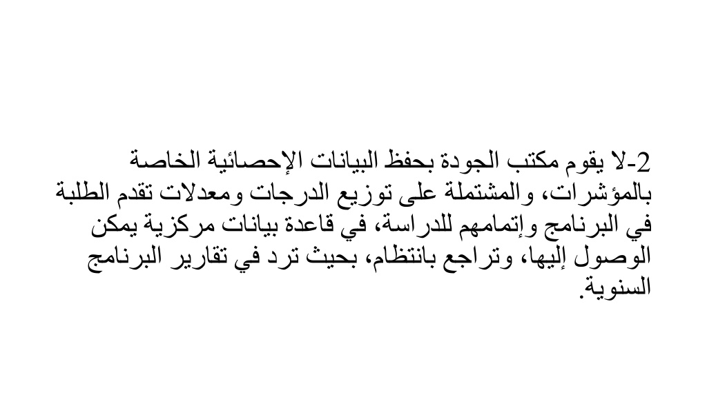 32. 2-لا يقوم مكتب الجودة بحفظ البيانات الإحصائية الخاصة بالمؤشرات، والمشتملة على توزيع الدرجات ومعدلات تقدم الطلبة في البرنامج وإتمامهم للدراسة، في قاعدة بيانات مركزية يمكن الوصول إليها، وتراجع بانتظام، بحيث ترد في تقارير البرنامج السنوية.
