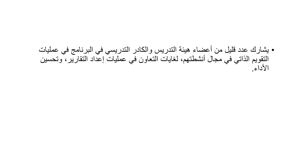 4. يشارك عدد قليل من أعضاء هيئة التدريس والكادر التدريسي في البرنامج في عمليات التقويم الذاتي في مجال أنشطتهم، لغايات التعاون في عمليات إعداد التقارير، وتحسين الأداء.