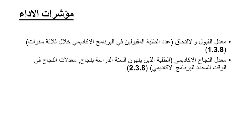 40. مؤشرات الاداء • معدل القبول والالتحاق (عدد الطلبة المقبولين في البرنامج الاكاديمي خلال ثلاثة سنوات) (1.3.8) • معدل النجاح الاكاديمي (الطلبة الذين ينهون السنة الدراسة بنجاح, معدلات النجاح في الوقت المحدد للبرنامج الاكاديمي) (2.3.8)