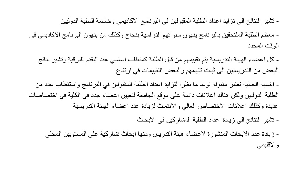 46. - تشير النتائج الى تزايد اعداد الطلبة المقبولين في البرنامج الاكاديمي وخاصة الطلبة الدوليين - معظم الطلبة الملتحقين بالبرنامج ينهون سنواتهم الدراسية بنجاح وكذلك من ينهون البرنامج الاكاديمي في الوقت المحدد - كل اعضاء الهيئة التدريسية يتم تقييمهم من قبل الطلبة كمتطلب اساسي عند التقدم للترقية وتشير نتائج البعض من التدريسيين الى ثبات تقييمهم والبعض التقييمات في ارتفاع - النسبة الحالية تعتبر مقبولة توعا ما نظرا لتزايد اعداد الطلبة المقبولين في البرنامج واستقطاب عدد من الطلبة الدوليين ولكن هناك اعلانات دائمة على موقع الجامعة لتعيين اعضاء جدد في الكلية في اختصاصات عديدة وكذلك اعلانات الاختصاص العالي والابتعاث لزيادة عدد اعضاء الهيئة التدريسية - تشير النتائج الى زيادة اعداد الطلبة المشاركين في الابحاث - زيادة عدد الابحاث المنشورة لاعضاء هيئة التدريس ومنها ابحاث تشاركية على المستويين المحلي والاقليمي