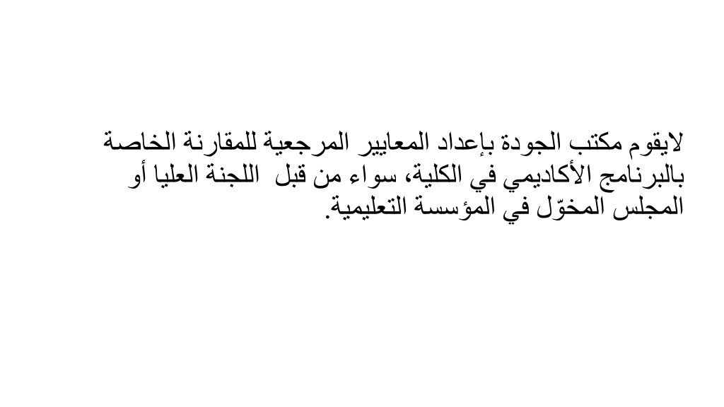 48. لايقوم مكتب الجودة بإعداد المعايير المرجعية للمقارنة الخاصة بالبرنامج الأكاديمي في الكلية، سواء من قبل اللجنة العليا أو المجلس المخوّل في المؤسسة التعليمية.