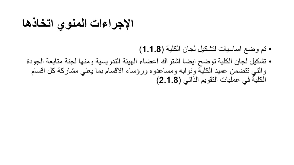 5. الإجراءات المنوي اتخاذها • تم وضع اساسيات لتشكيل لجان الكلية (1.1.8) • تشكيل لجان الكلية توضح ايضا اشتراك اعضاء الهيئة التدريسية ومنها لجنة متابعة الجودة والتي تتضمن عميد الكلية ونوابه ومساعدوه ورؤساء الاقسام بما يعني مشاركة كل اقسام الكلية في عمليات التقويم الذاتي (2.1.8)