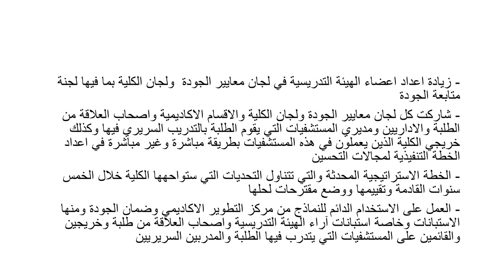 9. - زيادة اعداد اعضاء الهيئة التدريسية في لجان معايير الجودة ولجان الكلية بما فيها لجنة متابعة الجودة - شاركت كل لجان معايير الجودة ولجان الكلية والاقسام الاكاديمية واصحاب العلاقة من الطلبة والاداريين ومديري المستشفيات التي يقوم الطلبة بالتدريب السريري فيها وكذلك خريجي الكلية الذين يعملون في هذه المستشفيات بطريقة مباشرة وغير مباشرة في اعداد الخطة التنفيذية لمجالات التحسين - الخطة الاستراتيجية المحدثة والتي تتناول التحديات التي ستواحهها الكلية خلال الخمس سنوات القادمة وتقييمها ووضع مقترحات لحلها - العمل على الاستخدام الدائم للنماذج من مركز التطوير الاكاديمي وضمان الجودة ومنها الاستبانات وخاصة استبانات آراء الهيئة التدريسية واصحاب العلاقة من طلبة وخريجين والقائمين على المستشفيات التي يتدرب فيها الطلبة والمدربين السريريين