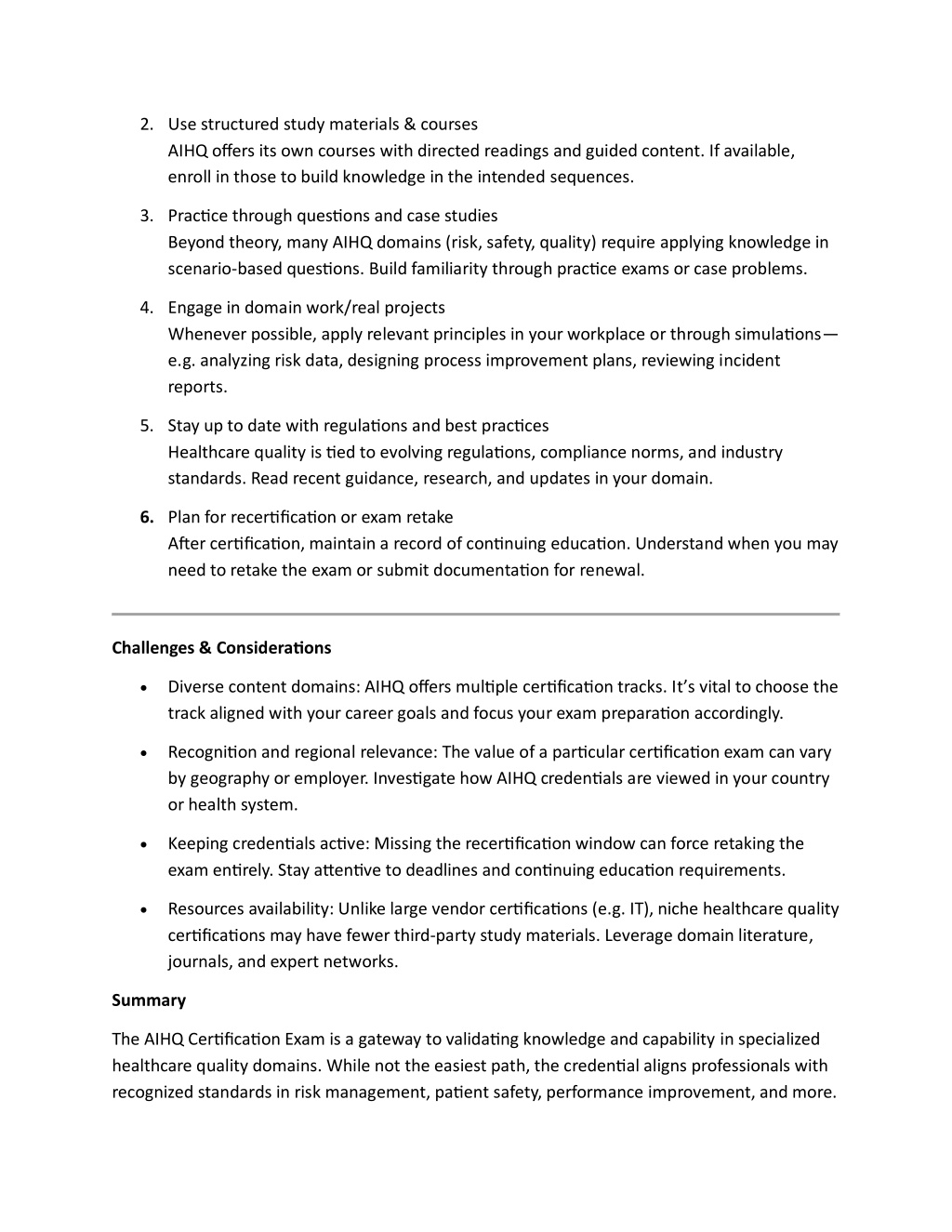 2.Use structured study materials & courses AIHQ offers its own courses with directed readings and guided content. If available, enroll in those to build knowledge in the intended sequences. 3.Practice through questions and case studies Beyond theory, many AIHQ domains (risk, safety, quality) require applying knowledge in scenario‐based questions. Build familiarity through practice exams or case problems. 4.Engage in domain work/real projects Whenever possible, apply relevant principles in your workplace or through simulations— e.g. analyzing risk data, designing process improvement plans, reviewing incident reports. 5.Stay up to date with regulations and best practices Healthcare quality is tied to evolving regulations, compliance norms, and industry standards. Read recent guidance, research, and updates in your domain. 6.Plan for recertification or exam retake After certification, maintain a record of continuing education. Understand when you may need to retake the exam or submit documentation for renewal. Challenges & Considerations Diverse content domains: AIHQ offers multiple certification tracks. It’s vital to choose the track aligned with your career goals and focus your exam preparation accordingly. Recognition and regional relevance: The value of a particular certification exam can vary by geography or employer. Investigate how AIHQ credentials are viewed in your country or health system. Keeping credentials active: Missing the recertification window can force retaking the exam entirely. Stay attentive to deadlines and continuing education requirements. Resources availability: Unlike large vendor certifications (e.g. IT), niche healthcare quality certifications may have fewer third‐party study materials. Leverage domain literature, journals, and expert networks. Summary The AIHQ Certification Exam is a gateway to validating knowledge and capability in specialized healthcare quality domains. While not the easiest path, the credential aligns professionals with recognized standards in risk management, patient safety, performance improvement, and more.
