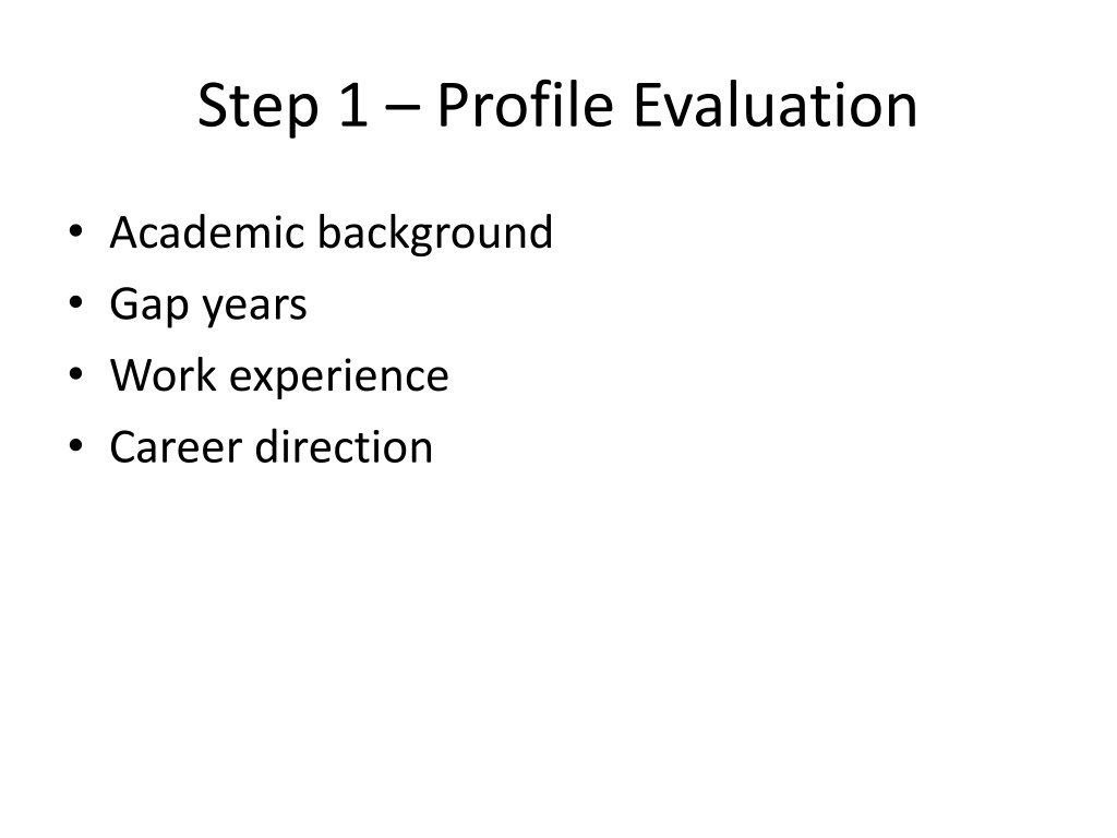 Step 1 – Profile Evaluation • Academic background • Gap years • Work experience • Career direction