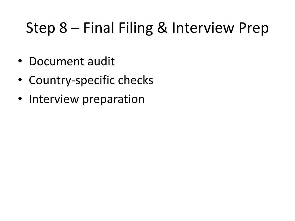Step 8 – Final Filing & Interview Prep • Document audit • Country-specific checks • Interview preparation
