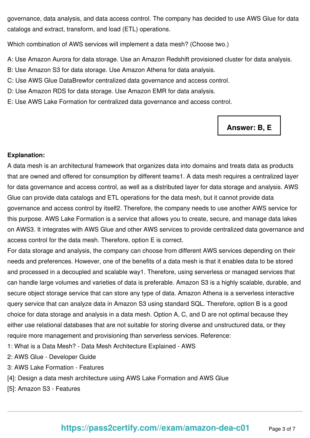 governance, data analysis, and data access control. The company has decided to use AWS Glue for data catalogs and extract, transform, and load (ETL) operations. Which combination of AWS services will implement a data mesh? (Choose two.) A: Use Amazon Aurora for data storage. Use an Amazon Redshift provisioned cluster for data analysis. B: Use Amazon S3 for data storage. Use Amazon Athena for data analysis. C: Use AWS Glue DataBrewfor centralized data governance and access control. D: Use Amazon RDS for data storage. Use Amazon EMR for data analysis. E: Use AWS Lake Formation for centralized data governance and access control. Answer: B, E Explanation: A data mesh is an architectural framework that organizes data into domains and treats data as products that are owned and offered for consumption by different teams1. A data mesh requires a centralized layer for data governance and access control, as well as a distributed layer for data storage and analysis. AWS Glue can provide data catalogs and ETL operations for the data mesh, but it cannot provide data governance and access control by itself2. Therefore, the company needs to use another AWS service for this purpose. AWS Lake Formation is a service that allows you to create, secure, and manage data lakes on AWS3. It integrates with AWS Glue and other AWS services to provide centralized data governance and access control for the data mesh. Therefore, option E is correct. For data storage and analysis, the company can choose from different AWS services depending on their needs and preferences. However, one of the benefits of a data mesh is that it enables data to be stored and processed in a decoupled and scalable way1. Therefore, using serverless or managed services that can handle large volumes and varieties of data is preferable. Amazon S3 is a highly scalable, durable, and secure object storage service that can store any type of data. Amazon Athena is a serverless interactive query service that can analyze data in Amazon S3 using standard SQL. Therefore, option B is a good choice for data storage and analysis in a data mesh. Option A, C, and D are not optimal because they either use relational databases that are not suitable for storing diverse and unstructured data, or they require more management and provisioning than serverless services. Reference: 1: What is a Data Mesh? - Data Mesh Architecture Explained - AWS 2: AWS Glue - Developer Guide 3: AWS Lake Formation - Features [4]: Design a data mesh architecture using AWS Lake Formation and AWS Glue [5]: Amazon S3 - Features https://pass2certify.com//exam/amazon-dea-c01 Page 3 of 7