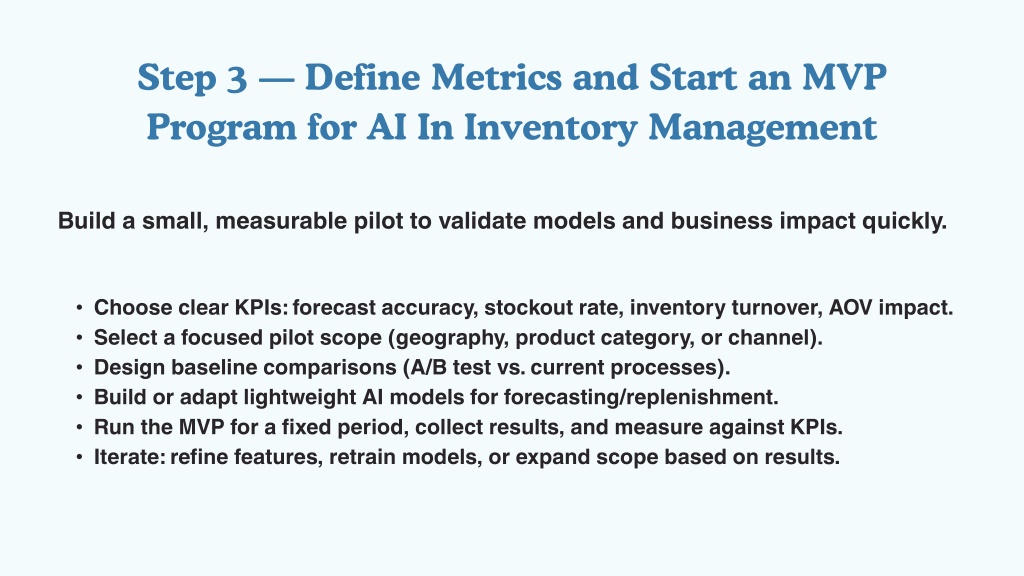 3. Step 3 — Define Metrics and Start an MVP Program for AI In Inventory Management Build a small, measurable pilot to validate models and business impact quickly. • Choose clear KPIs: forecast accuracy, stockout rate, inventory turnover, AOV impact. • Select a focused pilot scope (geography, product category, or channel). • Design baseline comparisons (A/B test vs. current processes). • Build or adapt lightweight AI models for forecasting/replenishment. • Run the MVP for a fixed period, collect results, and measure against KPIs. • Iterate: refine features, retrain models, or expand scope based on results.