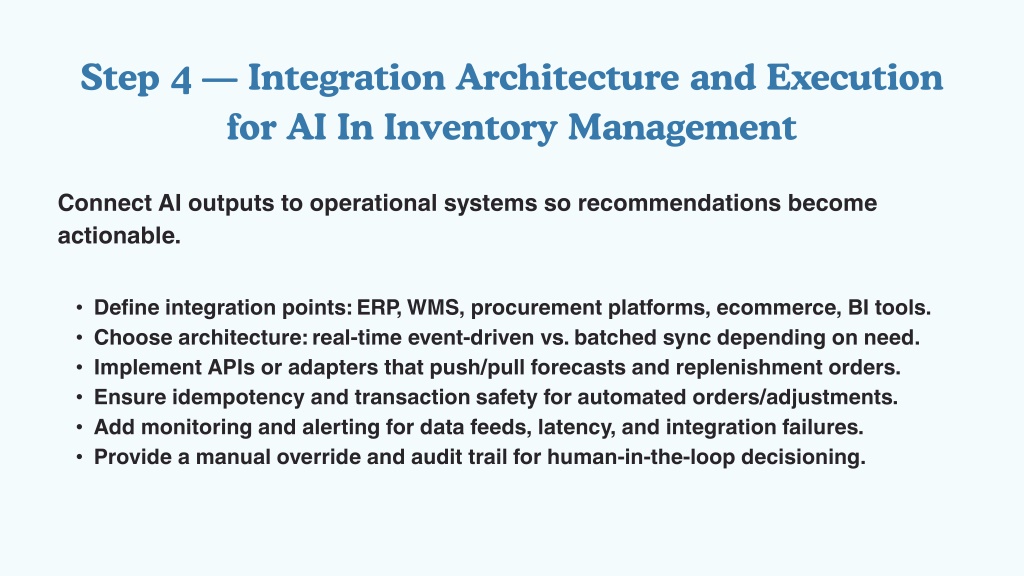 4. Step 4 — Integration Architecture and Execution for AI In Inventory Management Connect AI outputs to operational systems so recommendations become actionable. • Define integration points: ERP, WMS, procurement platforms, ecommerce, BI tools. • Choose architecture: real-time event-driven vs. batched sync depending on need. • Implement APIs or adapters that push/pull forecasts and replenishment orders. • Ensure idempotency and transaction safety for automated orders/adjustments. • Add monitoring and alerting for data feeds, latency, and integration failures. • Provide a manual override and audit trail for human-in-the-loop decisioning.