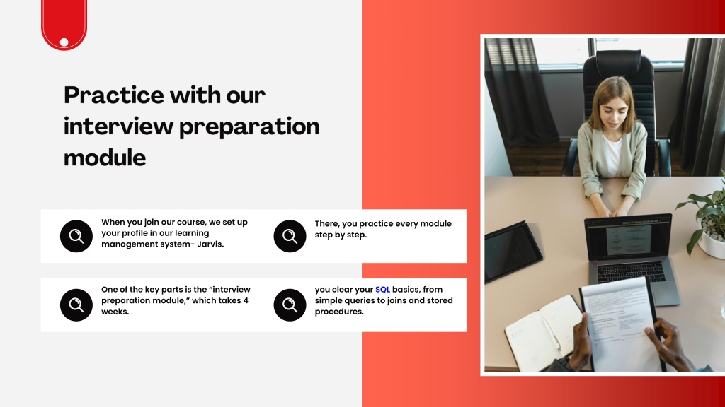 4. Practice with our interview preparation module When you join our course, we set up your profile in our learning management system- Jarvis. There, you practice every module step by step. One of the key parts is the “interview preparation module,” which takes 4 weeks. you clear your SQL basics, from simple queries to joins and stored procedures.