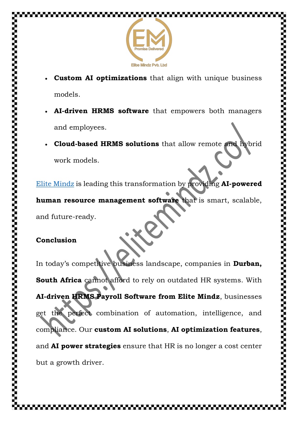 Custom AI optimizations that align with unique business models. AI-driven HRMS software that empowers both managers and employees. Cloud-based HRMS solutions that allow remote and hybrid work models. Elite Mindz is leading this transformation by providing AI-powered human resource management software that is smart, scalable, and future-ready. Conclusion In today’s competitive business landscape, companies in Durban, South Africa cannot afford to rely on outdated HR systems. With AI-driven HRMS Payroll Software from Elite Mindz, businesses get the perfect combination of automation, intelligence, and compliance. Our custom AI solutions, AI optimization features, and AI power strategies ensure that HR is no longer a cost center but a growth driver.