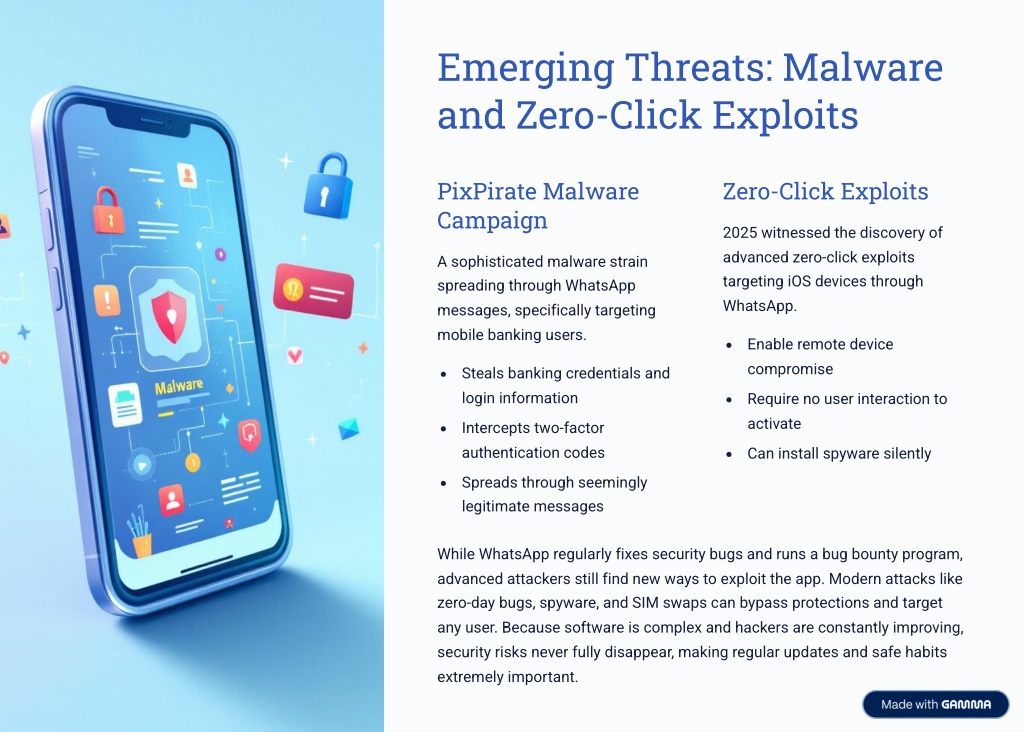 Emerging Threats: Malware and Zero-Click Exploits PixPirate Malware Campaign Zero-Click Exploits 2025 witnessed the discovery of advanced zero-click exploits targeting iOS devices through WhatsApp. A sophisticated malware strain spreading through WhatsApp messages, specifically targeting mobile banking users. Enable remote device compromise Steals banking credentials and login information Require no user interaction to activate Intercepts two-factor authentication codes Can install spyware silently Spreads through seemingly legitimate messages While WhatsApp regularly fixes security bugs and runs a bug bounty program, advanced attackers still find new ways to exploit the app. Modern attacks like zero-day bugs, spyware, and SIM swaps can bypass protections and target any user. Because software is complex and hackers are constantly improving, security risks never fully disappear, making regular updates and safe habits extremely important.