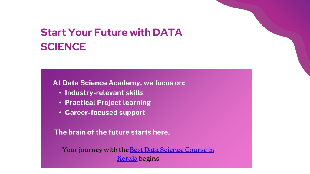 10. Start Your Future with DATA SCIENCE • At Data Science Academy, we focus on: • Industry-relevant skills • Practical Project learning • Career-focused support • The brain of the future starts here. Your journey with the Best Data Science Course in Kerala begins