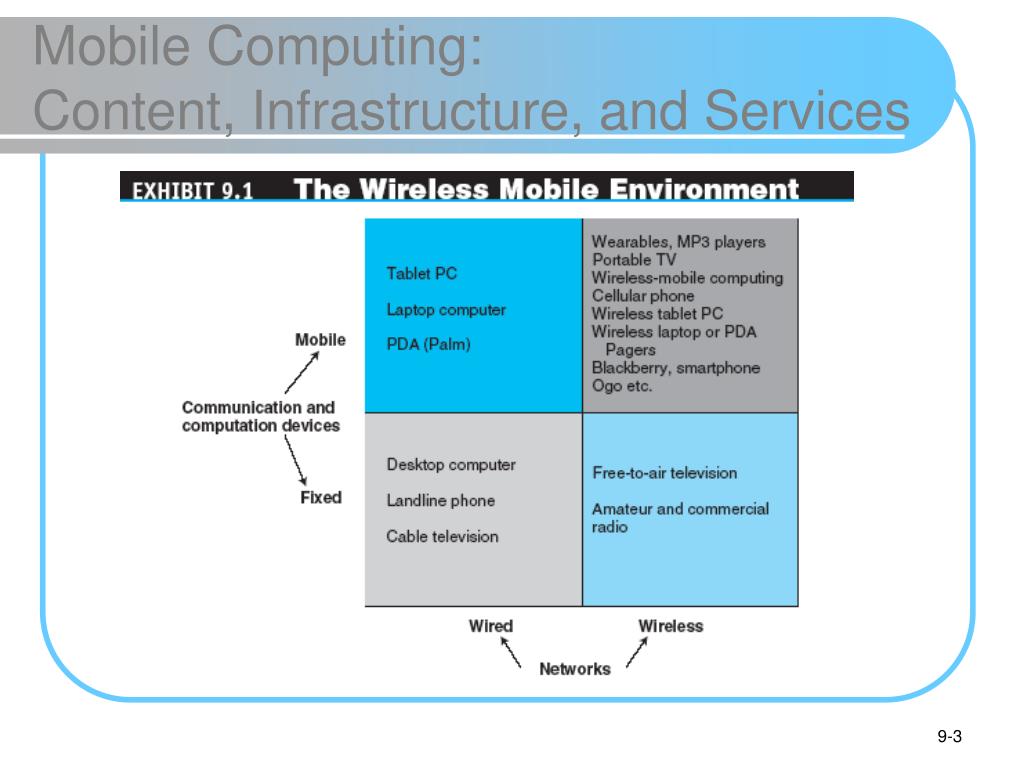 Chapter 9. Mobile Computing and Commerce and Pervasive Computing. Mobile Computing: Content, Infrastructure, and Services. New Computing Environment: Mobile Computing Mobile devices personal digital assistant (PDA) A handheld computer principally used for personal information management