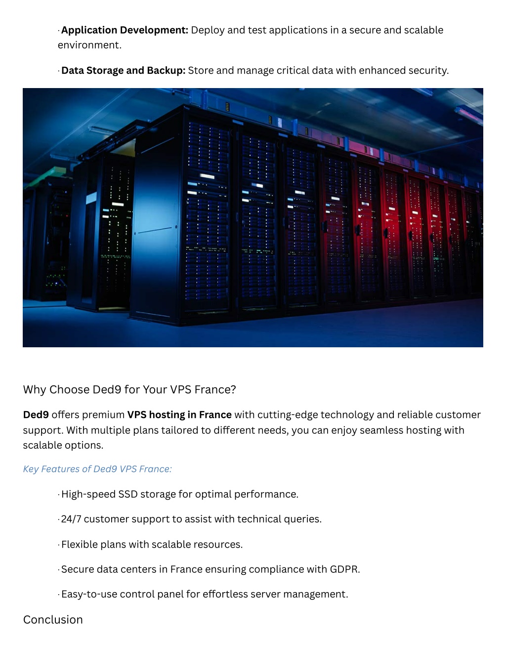 ·Application Development: Deploy and test applications in a secure and scalable environment. ·Data Storage and Backup: Store and manage critical data with enhanced security. Why Choose Ded9 for Your VPS France? Ded9 offers premium VPS hosting in France with cutting-edge technology and reliable customer support. With multiple plans tailored to different needs, you can enjoy seamless hosting with scalable options. Key Features of Ded9 VPS France: ·High-speed SSD storage for optimal performance. ·24/7 customer support to assist with technical queries. ·Flexible plans with scalable resources. ·Secure data centers in France ensuring compliance with GDPR. ·Easy-to-use control panel for effortless server management. Conclusion