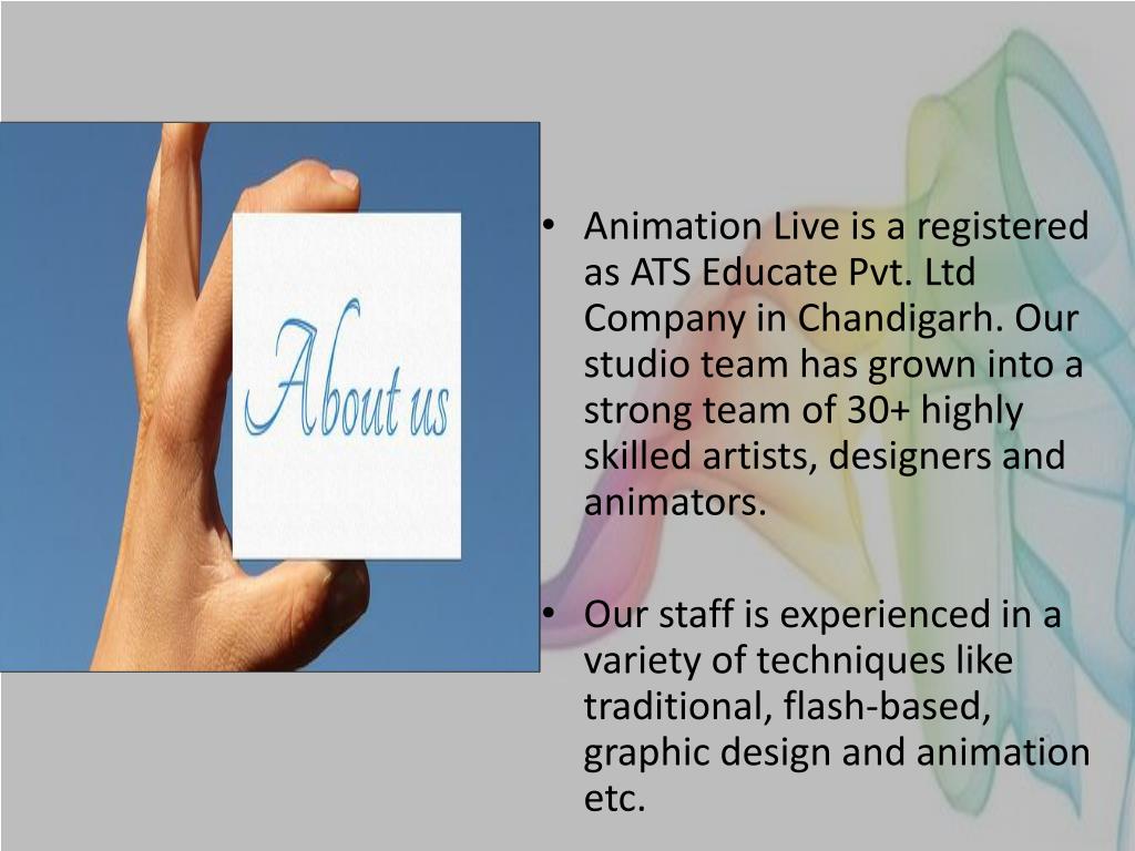 Animation Live is a registered as ATS Educate Pvt. Ltd Company in Chandigarh. Our studio team has grown into a strong team of 30+ highly skilled artists, designers and animators. • Our staff is experienced in a variety of techniques like traditional, flash-based, graphic design and animation etc.