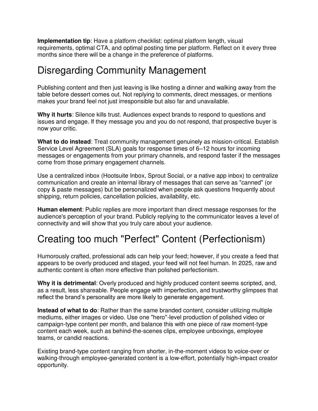Implementation tip: Have a platform checklist: optimal platform length, visual requirements, optimal CTA, and optimal posting time per platform. Reflect on it every three months since there will be a change in the preference of platforms. Disregarding Community Management Publishing content and then just leaving is like hosting a dinner and walking away from the table before dessert comes out. Not replying to comments, direct messages, or mentions makes your brand feel not just irresponsible but also far and unavailable. Why it hurts: Silence kills trust. Audiences expect brands to respond to questions and issues and engage. If they message you and you do not respond, that prospective buyer is now your critic. What to do instead: Treat community management genuinely as mission-critical. Establish Service Level Agreement (SLA) goals for response times of 6–12 hours for incoming messages or engagements from your primary channels, and respond faster if the messages come from those primary engagement channels. Use a centralized inbox (Hootsuite Inbox, Sprout Social, or a native app inbox) to centralize communication and create an internal library of messages that can serve as "canned" (or copy & paste messages) but be personalized when people ask questions frequently about shipping, return policies, cancellation policies, availability, etc. Human element: Public replies are more important than direct message responses for the audience's perception of your brand. Publicly replying to the communicator leaves a level of connectivity and will show that you truly care about your audience. Creating too much "Perfect" Content (Perfectionism) Humorously crafted, professional ads can help your feed; however, if you create a feed that appears to be overly produced and staged, your feed will not feel human. In 2025, raw and authentic content is often more effective than polished perfectionism. Why it is detrimental: Overly produced and highly produced content seems scripted, and, as a result, less shareable. People engage with imperfection, and trustworthy glimpses that reflect the brand’s personality are more likely to generate engagement. Instead of what to do: Rather than the same branded content, consider utilizing multiple mediums, either images or video. Use one "hero"-level production of polished video or campaign-type content per month, and balance this with one piece of raw moment-type content each week, such as behind-the-scenes clips, employee unboxings, employee teams, or candid reactions. Existing brand-type content ranging from shorter, in-the-moment videos to voice-over or walking-through employee-generated content is a low-effort, potentially high-impact creator opportunity.