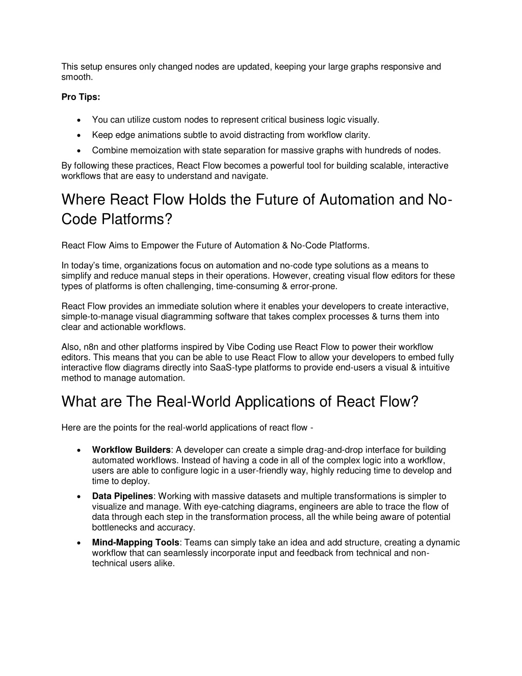 This setup ensures only changed nodes are updated, keeping your large graphs responsive and smooth. Pro Tips: You can utilize custom nodes to represent critical business logic visually. Keep edge animations subtle to avoid distracting from workflow clarity. Combine memoization with state separation for massive graphs with hundreds of nodes. By following these practices, React Flow becomes a powerful tool for building scalable, interactive workflows that are easy to understand and navigate. Where React Flow Holds the Future of Automation and No- Code Platforms? React Flow Aims to Empower the Future of Automation & No-Code Platforms. In today’s time, organizations focus on automation and no-code type solutions as a means to simplify and reduce manual steps in their operations. However, creating visual flow editors for these types of platforms is often challenging, time-consuming & error-prone. React Flow provides an immediate solution where it enables your developers to create interactive, simple-to-manage visual diagramming software that takes complex processes & turns them into clear and actionable workflows. Also, n8n and other platforms inspired by Vibe Coding use React Flow to power their workflow editors. This means that you can be able to use React Flow to allow your developers to embed fully interactive flow diagrams directly into SaaS-type platforms to provide end-users a visual & intuitive method to manage automation. What are The Real-World Applications of React Flow? Here are the points for the real-world applications of react flow - Workflow Builders: A developer can create a simple drag-and-drop interface for building automated workflows. Instead of having a code in all of the complex logic into a workflow, users are able to configure logic in a user-friendly way, highly reducing time to develop and time to deploy. Data Pipelines: Working with massive datasets and multiple transformations is simpler to visualize and manage. With eye-catching diagrams, engineers are able to trace the flow of data through each step in the transformation process, all the while being aware of potential bottlenecks and accuracy. Mind-Mapping Tools: Teams can simply take an idea and add structure, creating a dynamic workflow that can seamlessly incorporate input and feedback from technical and non- technical users alike.