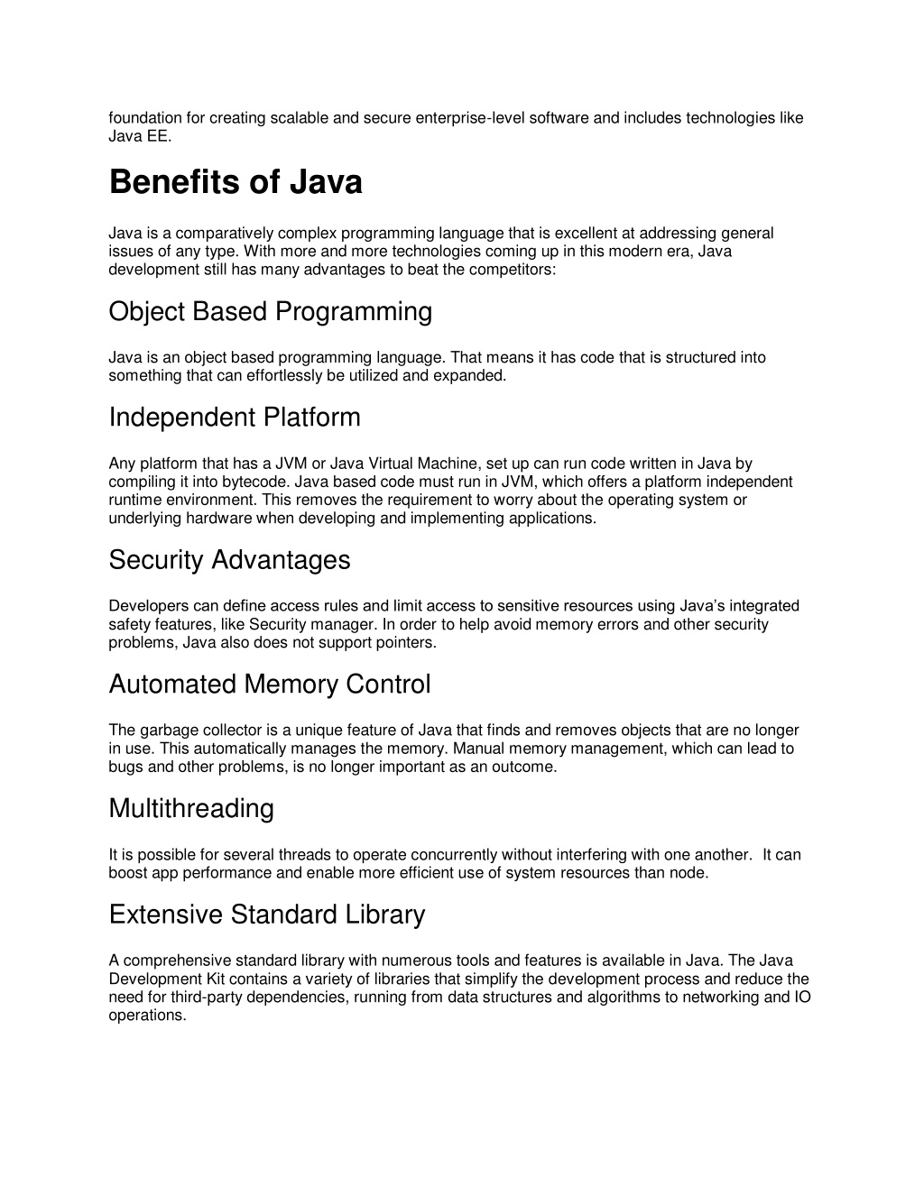 foundation for creating scalable and secure enterprise-level software and includes technologies like Java EE. Benefits of Java Java is a comparatively complex programming language that is excellent at addressing general issues of any type. With more and more technologies coming up in this modern era, Java development still has many advantages to beat the competitors: Object Based Programming Java is an object based programming language. That means it has code that is structured into something that can effortlessly be utilized and expanded. Independent Platform Any platform that has a JVM or Java Virtual Machine, set up can run code written in Java by compiling it into bytecode. Java based code must run in JVM, which offers a platform independent runtime environment. This removes the requirement to worry about the operating system or underlying hardware when developing and implementing applications. Security Advantages Developers can define access rules and limit access to sensitive resources using Java’s integrated safety features, like Security manager. In order to help avoid memory errors and other security problems, Java also does not support pointers. Automated Memory Control The garbage collector is a unique feature of Java that finds and removes objects that are no longer in use. This automatically manages the memory. Manual memory management, which can lead to bugs and other problems, is no longer important as an outcome. Multithreading It is possible for several threads to operate concurrently without interfering with one another. It can boost app performance and enable more efficient use of system resources than node. Extensive Standard Library A comprehensive standard library with numerous tools and features is available in Java. The Java Development Kit contains a variety of libraries that simplify the development process and reduce the need for third-party dependencies, running from data structures and algorithms to networking and IO operations.