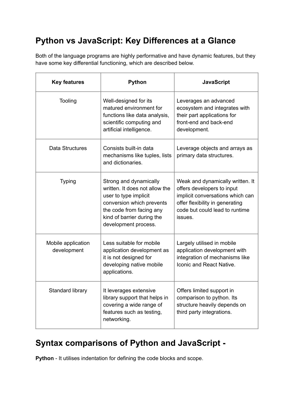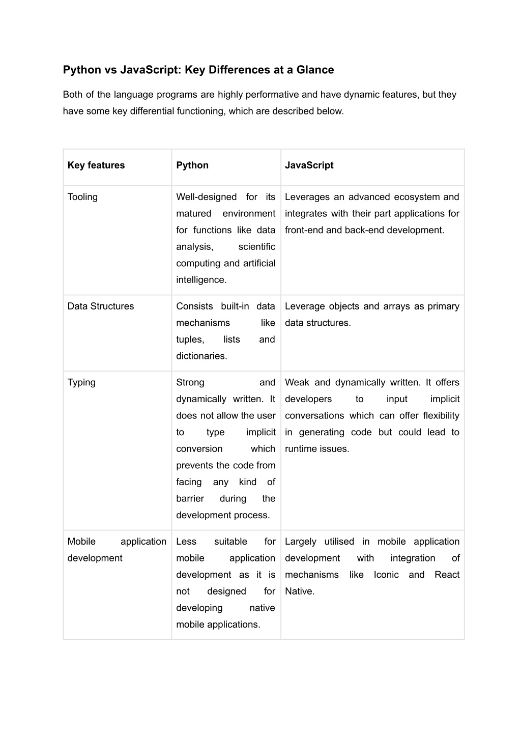 Python vs JavaScript: Key Differences at a Glance Both of the language programs are highly performative and have dynamic features, but they have some key differential functioning, which are described below. Key features Python JavaScript Tooling Well-designed for its Leverages an advanced ecosystem and matured environment integrates with their part applications for for functions like data front-end and back-end development. analysis, scientific computing and artificial intelligence. Data Structures Consists built-in data Leverage objects and arrays as primary mechanisms like data structures. tuples, lists and dictionaries. Typing Strong and Weak and dynamically written. It offers dynamically written. It developers to input implicit does not allow the user conversations which can offer flexibility to type implicit in generating code but could lead to conversion which runtime issues. prevents the code from facing any kind of barrier during the development process. Mobile application Less suitable for Largely utilised in mobile application development mobile application development with integration of development as it is mechanisms like Iconic and React not designed for Native. developing native mobile applications.