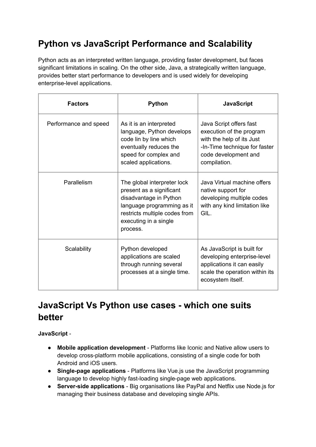 Python vs JavaScript Performance and Scalability Python acts as an interpreted written language, providing faster development, but faces significant limitations in scaling. On the other side, Java, a strategically written language, provides better start performance to developers and is used widely for developing enterprise-level applications. Factors Python JavaScript Performance and speed As it is an interpreted language, Python develops code lin by line which eventually reduces the speed for complex and scaled applications. Java Script offers fast execution of the program with the help of its Just -In-Time technique for faster code development and compilation. Parallelism The global interpreter lock present as a significant disadvantage in Python language programming as it restricts multiple codes from executing in a single process. Java Virtual machine offers native support for developing multiple codes with any kind limitation like GIL. Scalability Python developed applications are scaled through running several processes at a single time. As JavaScript is built for developing enterprise-level applications it can easily scale the operation within its ecosystem itself. JavaScript Vs Python use cases - which one suits better JavaScript - ● Mobile application development - Platforms like Iconic and Native allow users to develop cross-platform mobile applications, consisting of a single code for both Android and iOS users. ● Single-page applications - Platforms like Vue.js use the JavaScript programming language to develop highly fast-loading single-page web applications. ● Server-side applications - Big organisations like PayPal and Netflix use Node.js for managing their business database and developing single APIs.