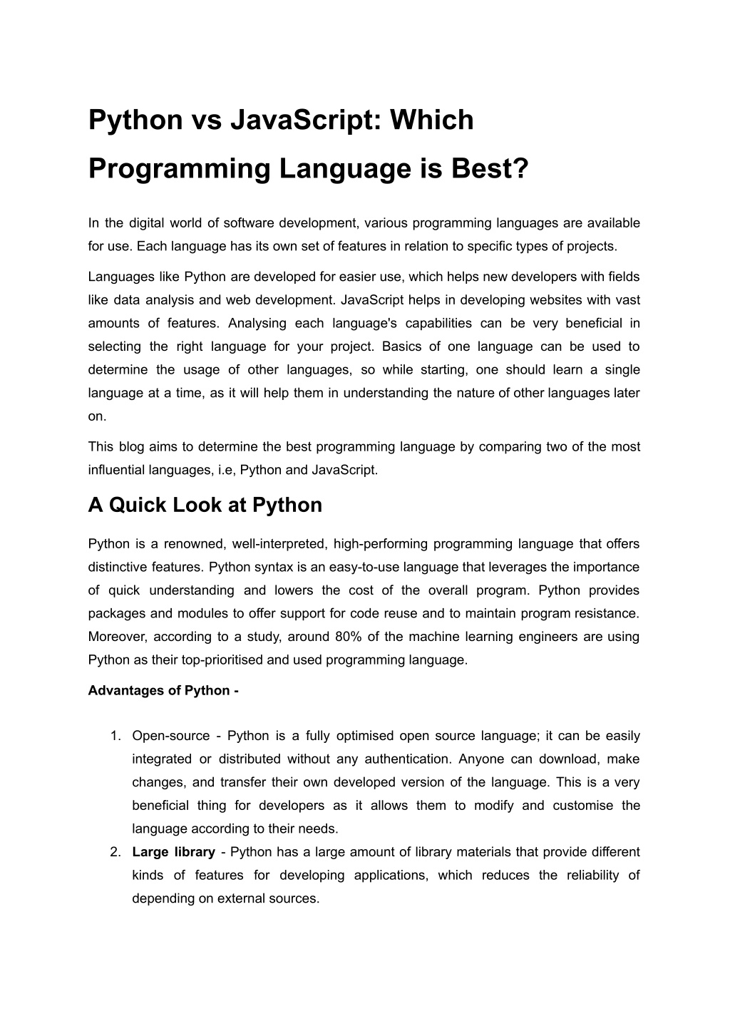 Python vs JavaScript: Which Programming Language is Best? In the digital world of software development, various programming languages are available for use. Each language has its own set of features in relation to specific types of projects. Languages like Python are developed for easier use, which helps new developers with fields like data analysis and web development. JavaScript helps in developing websites with vast amounts of features. Analysing each language's capabilities can be very beneficial in selecting the right language for your project. Basics of one language can be used to determine the usage of other languages, so while starting, one should learn a single language at a time, as it will help them in understanding the nature of other languages later on. This blog aims to determine the best programming language by comparing two of the most influential languages, i.e, Python and JavaScript. A Quick Look at Python Python is a renowned, well-interpreted, high-performing programming language that offers distinctive features. Python syntax is an easy-to-use language that leverages the importance of quick understanding and lowers the cost of the overall program. Python provides packages and modules to offer support for code reuse and to maintain program resistance. Moreover, according to a study, around 80% of the machine learning engineers are using Python as their top-prioritised and used programming language. Advantages of Python - 1. Open-source - Python is a fully optimised open source language; it can be easily integrated or distributed without any authentication. Anyone can download, make changes, and transfer their own developed version of the language. This is a very beneficial thing for developers as it allows them to modify and customise the language according to their needs. 2. Large library - Python has a large amount of library materials that provide different kinds of features for developing applications, which reduces the reliability of depending on external sources.