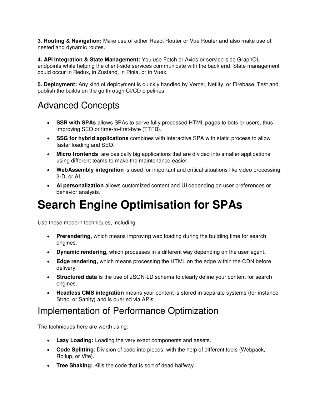 5. 3. Routing & Navigation: Make use of either React Router or Vue Router and also make use of nested and dynamic routes. 4. API Integration & State Management: You use Fetch or Axios or service-side GraphQL endpoints while helping the client-side services communicate with the back end. State management could occur in Redux, in Zustand, in Pinia, or in Vuex. 5. Deployment: Any kind of deployment is quickly handled by Vercel, Netlify, or Firebase. Test and publish the builds on the go through CI/CD pipelines. Advanced Concepts  SSR with SPAs allows SPAs to serve fully processed HTML pages to bots or users, thus improving SEO or time-to-first-byte (TTFB). SSG for hybrid applications combines with interactive SPA with static process to allow faster loading and SEO. Micro frontends are basically big applications that are divided into smaller applications using different teams to make the maintenance easier.    WebAssembly integration is used for important and critical situations like video processing, 3-D, or AI. AI personalization allows customized content and UI depending on user preferences or behavior analysis. Search Engine Optimisation for SPAs  Use these modern techniques, including  Prerendering, which means improving web loading during the building time for search engines.  Dynamic rendering, which processes in a different way depending on the user agent.  Edge rendering, which means processing the HTML on the edge within the CDN before delivery. Structured data is the use of JSON-LD schema to clearly define your content for search engines.   Headless CMS integration means your content is stored in separate systems (for instance, Strapi or Sanity) and is queried via APIs. Implementation of Performance Optimization The techniques here are worth using:  Lazy Loading: Loading the very exact components and assets.  Code Splitting: Division of code into pieces, with the help of different tools (Webpack, Rollup, or Vite).  Tree Shaking: Kills the code that is sort of dead halfway.