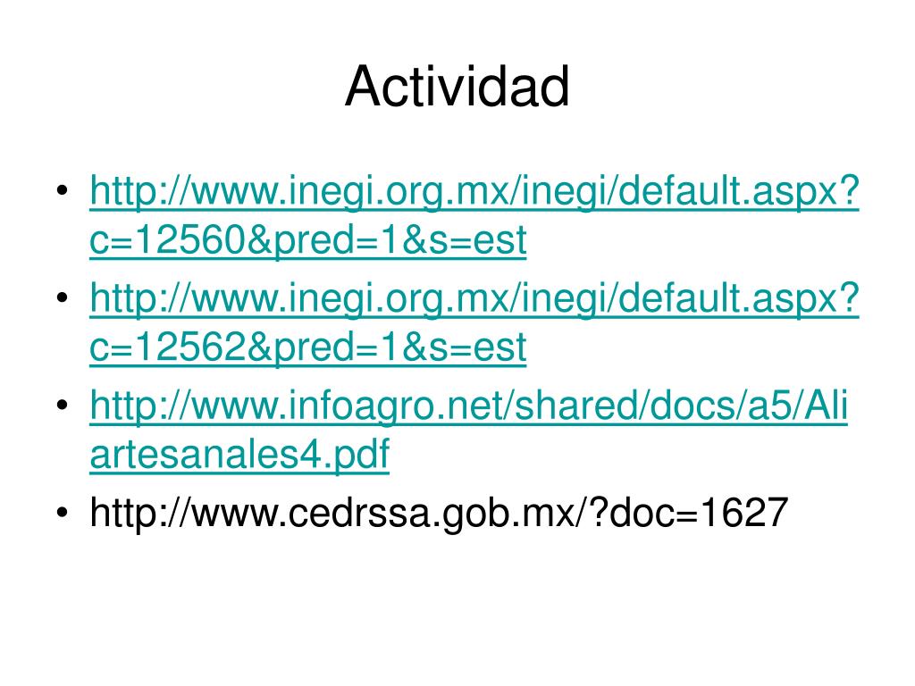 Actividad • http://www.inegi.org.mx/inegi/default.aspx?c=12560&pred=1&s=est • http://www.inegi.org.mx/inegi/default.aspx?c=12562&pred=1&s=est • http://www.infoagro.net/shared/docs/a5/Aliartesanales4.pdf • http://www.cedrssa.gob.mx/?doc=1627