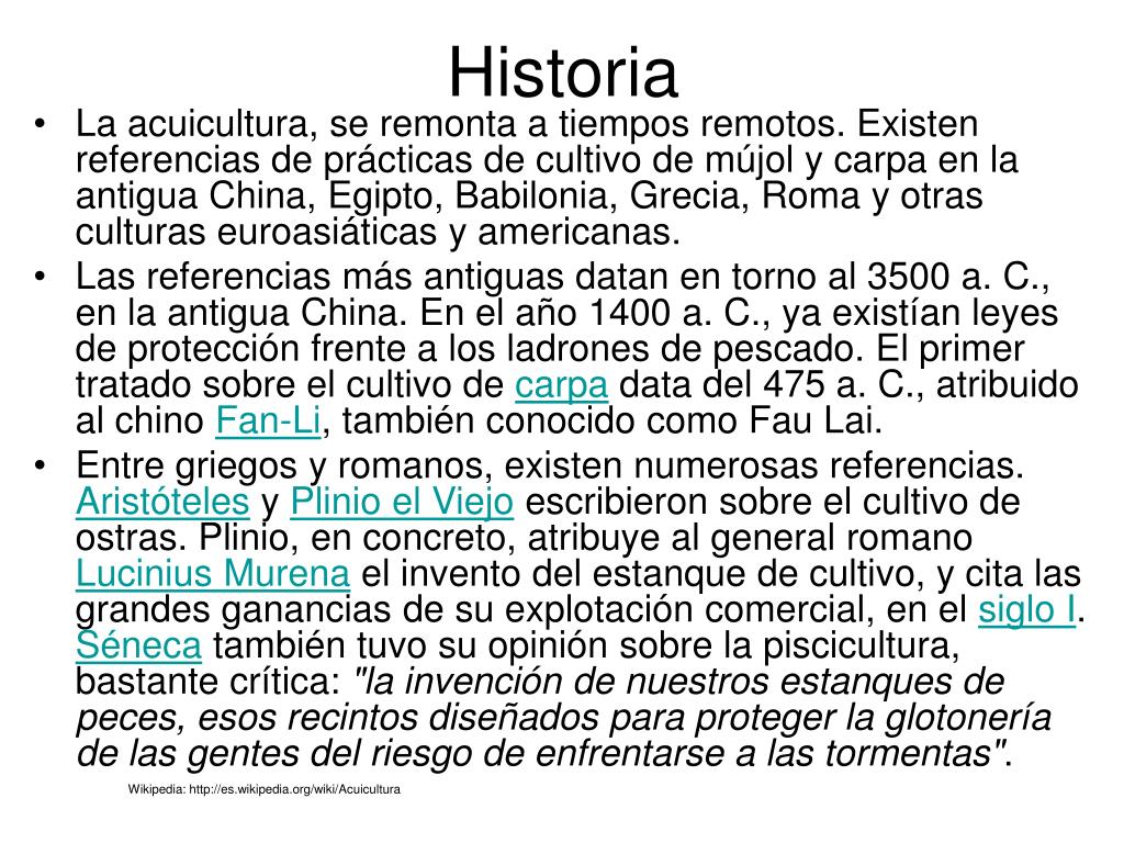 Historia • La acuicultura, se remonta a tiempos remotos. Existen referencias de prácticas de cultivo de mújol y carpa en la antigua China, Egipto, Babilonia, Grecia, Roma y otras culturas euroasiáticas y americanas. • Las referencias más antiguas datan en torno al 3500 a. C., en la antigua China. En el año 1400 a. C., ya existían leyes de protección frente a los ladrones de pescado. El primer tratado sobre el cultivo de carpa data del 475 a. C., atribuido al chino Fan-Li, también conocido como Fau Lai. • Entre griegos y romanos, existen numerosas referencias. Aristóteles y Plinio el Viejo escribieron sobre el cultivo de ostras. Plinio, en concreto, atribuye al general romano Lucinius Murena el invento del estanque de cultivo, y cita las grandes ganancias de su explotación comercial, en el siglo I. Séneca también tuvo su opinión sobre la piscicultura, bastante crítica: "la invención de nuestros estanques de peces, esos recintos diseñados para proteger la glotonería de las gentes del riesgo de enfrentarse a las tormentas". Wikipedia: http://es.wikipedia.org/wiki/Acuicultura