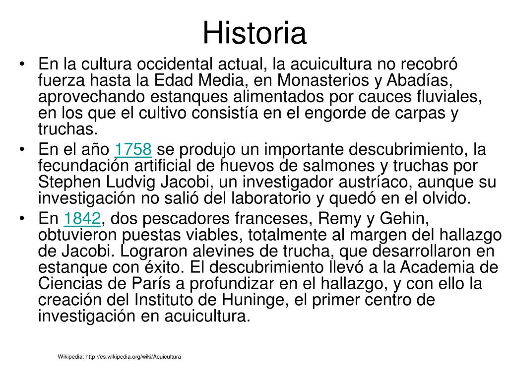 Historia • En la cultura occidental actual, la acuicultura no recobró fuerza hasta la Edad Media, en Monasterios y Abadías, aprovechando estanques alimentados por cauces fluviales, en los que el cultivo consistía en el engorde de carpas y truchas. • En el año 1758 se produjo un importante descubrimiento, la fecundación artificial de huevos de salmones y truchas por Stephen Ludvig Jacobi, un investigador austríaco, aunque su investigación no salió del laboratorio y quedó en el olvido. • En 1842, dos pescadores franceses, Remy y Gehin, obtuvieron puestas viables, totalmente al margen del hallazgo de Jacobi. Lograron alevines de trucha, que desarrollaron en estanque con éxito. El descubrimiento llevó a la Academia de Ciencias de París a profundizar en el hallazgo, y con ello la creación del Instituto de Huninge, el primer centro de investigación en acuicultura. Wikipedia: http://es.wikipedia.org/wiki/Acuicultura