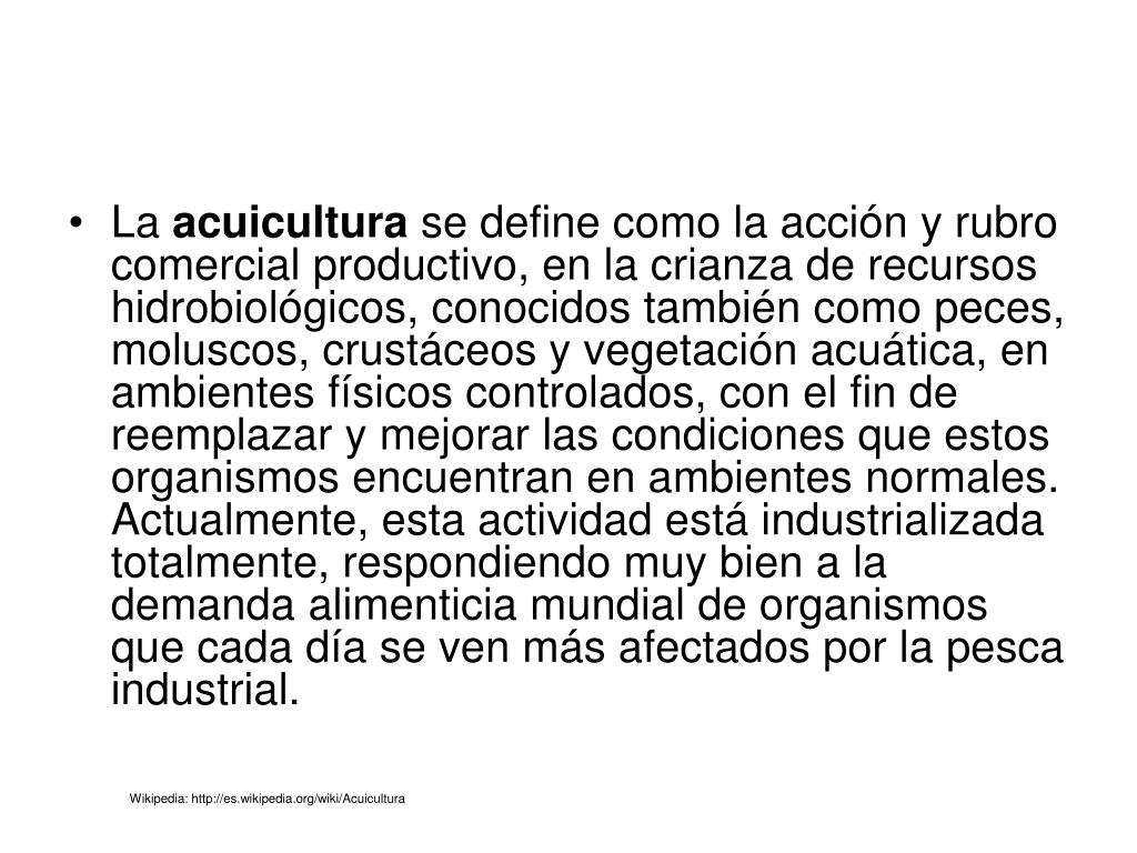 La acuicultura se define como la acción y rubro comercial productivo, en la crianza de recursos hidrobiológicos, conocidos también como peces, moluscos, crustáceos y vegetación acuática, en ambientes físicos controlados, con el fin de reemplazar y mejorar las condiciones que estos organismos encuentran en ambientes normales. Actualmente, esta actividad está industrializada totalmente, respondiendo muy bien a la demanda alimenticia mundial de organismos que cada día se ven más afectados por la pesca industrial. Wikipedia: http://es.wikipedia.org/wiki/Acuicultura