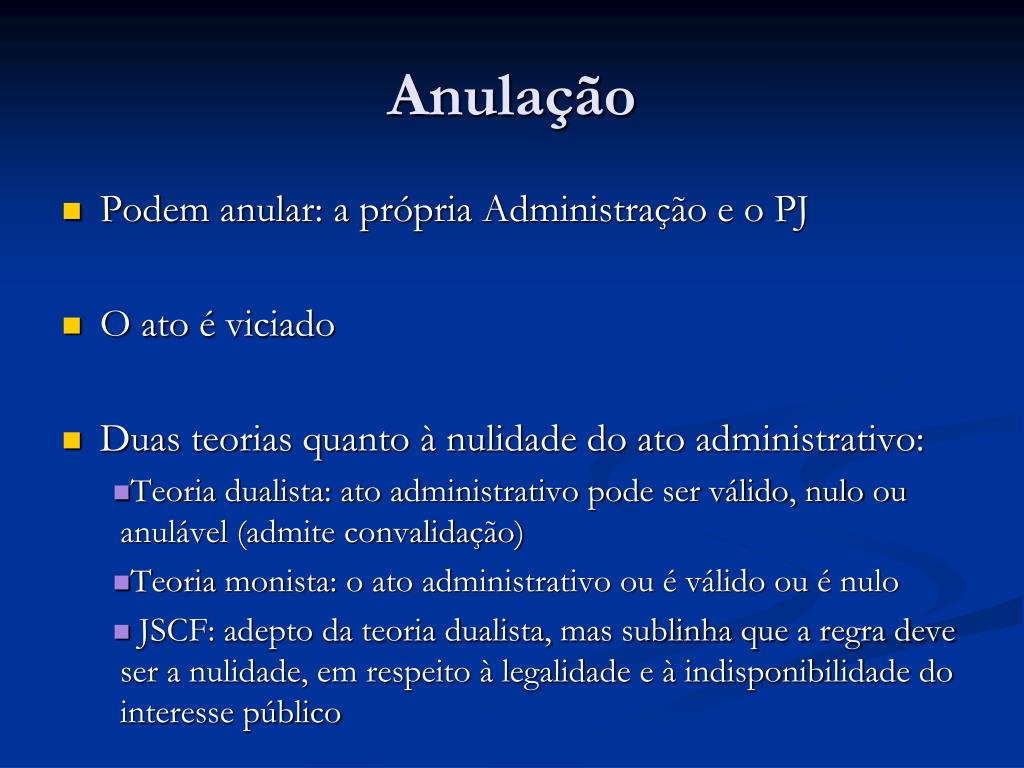Anulação • Podem anular: a própria Administração e o PJ • O ato é viciado • Duas teorias quanto à nulidade do ato administrativo: • Teoria dualista: ato administrativo pode ser válido, nulo ou anulável (admite convalidação) • Teoria monista: o ato administrativo ou é válido ou é nulo • JSCF: adepto da teoria dualista, mas sublinha que a regra deve ser a nulidade, em respeito à legalidade e à indisponibilidade do interesse público
