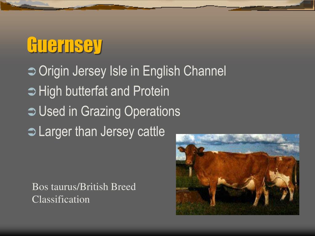 Guernsey • Origin Jersey Isle in English Channel • High butterfat and Protein • Used in Grazing Operations • Larger than Jersey cattle Bos taurus/British Breed Classification