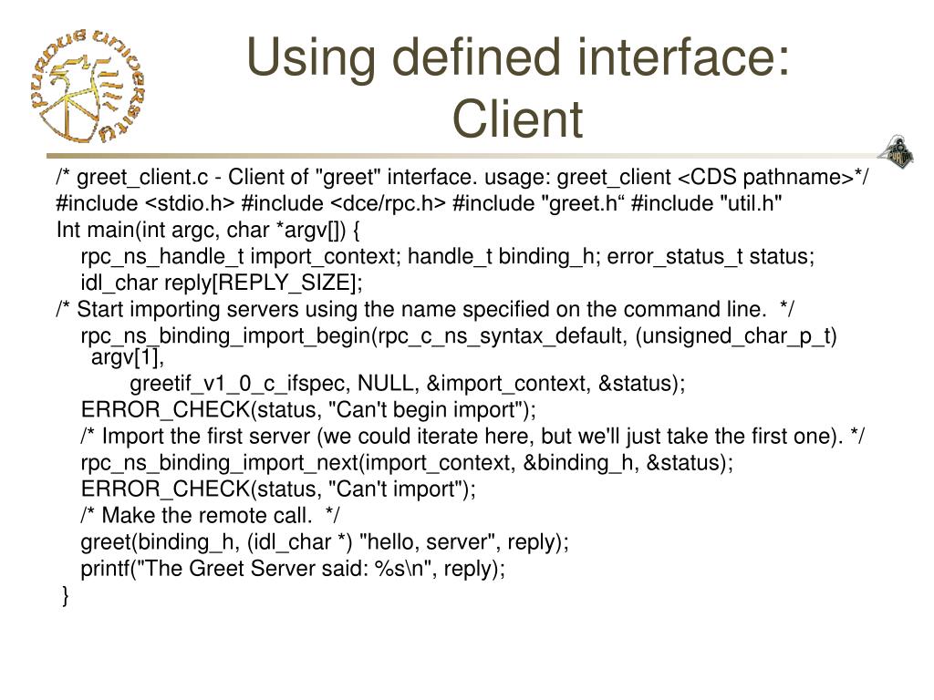 Using defined interface:Client /* greet_client.c - Client of "greet" interface. usage: greet_client <CDS pathname>*/ #include <stdio.h> #include <dce/rpc.h> #include "greet.h“ #include "util.h" Int main(int argc, char *argv[]) { rpc_ns_handle_t import_context; handle_t binding_h; error_status_t status; idl_char reply[REPLY_SIZE]; /* Start importing servers using the name specified on the command line. */ rpc_ns_binding_import_begin(rpc_c_ns_syntax_default, (unsigned_char_p_t) argv[1], greetif_v1_0_c_ifspec, NULL, &import_context, &status); ERROR_CHECK(status, "Can't begin import"); /* Import the first server (we could iterate here, but we'll just take the first one). */ rpc_ns_binding_import_next(import_context, &binding_h, &status); ERROR_CHECK(status, "Can't import"); /* Make the remote call. */ greet(binding_h, (idl_char *) "hello, server", reply); printf("The Greet Server said: %s\n", reply); }