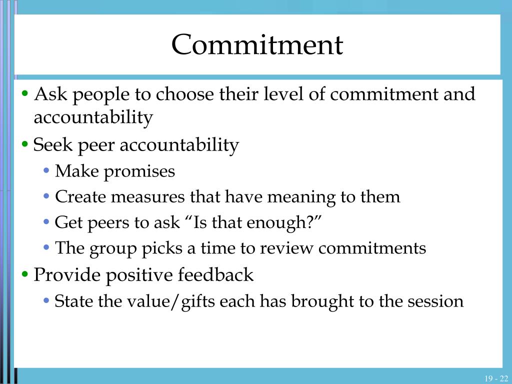 Commitment • Ask people to choose their level of commitment and accountability • Seek peer accountability • Make promises • Create measures that have meaning to them • Get peers to ask “Is that enough?” • The group picks a time to review commitments • Provide positive feedback • State the value/gifts each has brought to the session
