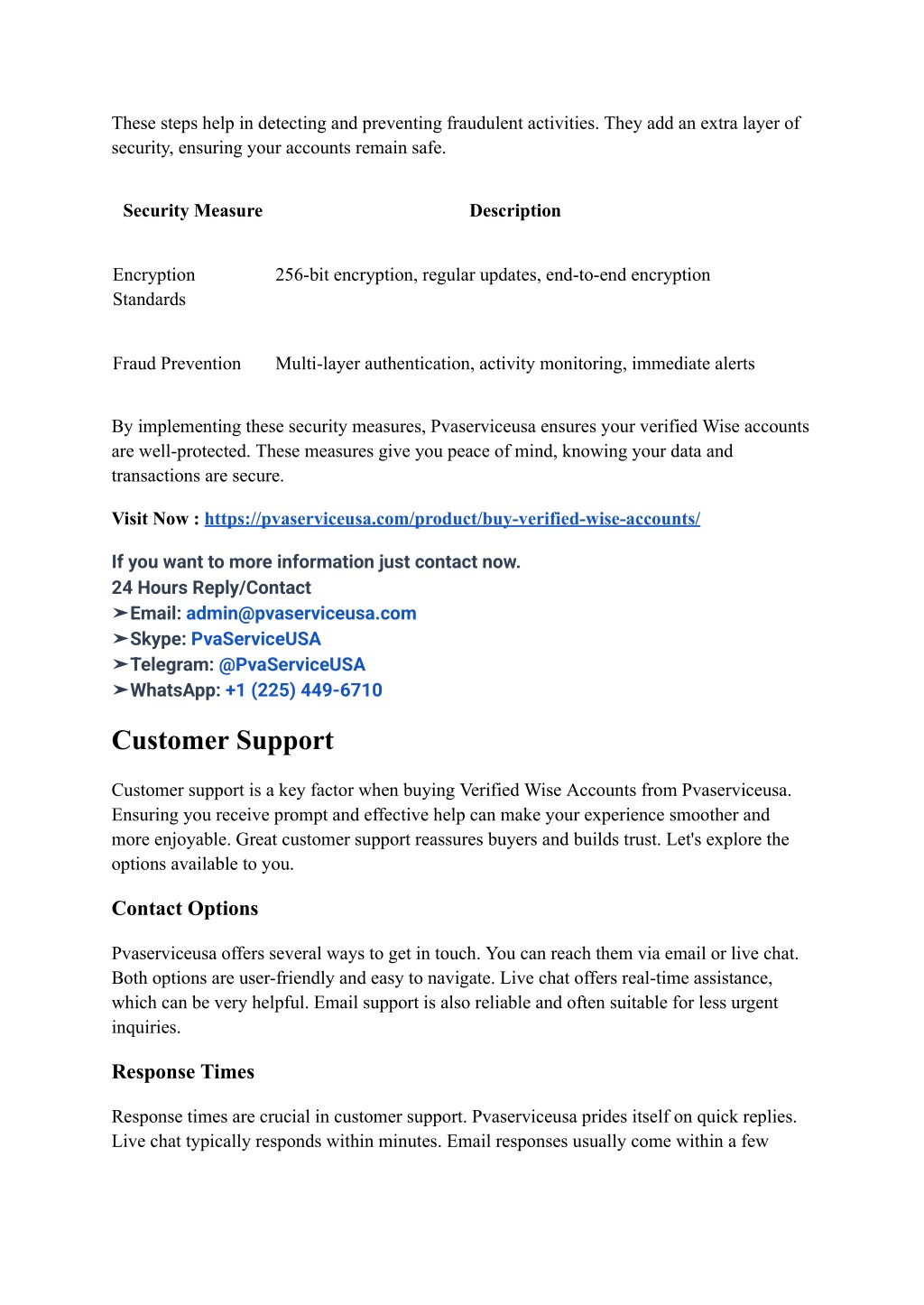 These steps help in detecting and preventing fraudulent activities. They add an extra layer of security, ensuring your accounts remain safe. Security Measure Description Encryption Standards 256-bit encryption, regular updates, end-to-end encryption Fraud Prevention Multi-layer authentication, activity monitoring, immediate alerts By implementing these security measures, Pvaserviceusa ensures your verified Wise accounts are well-protected. These measures give you peace of mind, knowing your data and transactions are secure. Visit Now : https://pvaserviceusa.com/product/buy-verified-wise-accounts/ If you want to more information just contact now. 24 Hours Reply/Contact ➤Email: admin@pvaserviceusa.com ➤Skype: PvaServiceUSA ➤Telegram: @PvaServiceUSA ➤WhatsApp: +1 (225) 449-6710 Customer Support Customer support is a key factor when buying Verified Wise Accounts from Pvaserviceusa. Ensuring you receive prompt and effective help can make your experience smoother and more enjoyable. Great customer support reassures buyers and builds trust. Let's explore the options available to you. Contact Options Pvaserviceusa offers several ways to get in touch. You can reach them via email or live chat. Both options are user-friendly and easy to navigate. Live chat offers real-time assistance, which can be very helpful. Email support is also reliable and often suitable for less urgent inquiries. Response Times Response times are crucial in customer support. Pvaserviceusa prides itself on quick replies. Live chat typically responds within minutes. Email responses usually come within a few