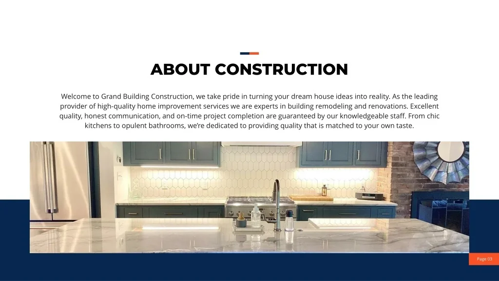 ABOUT CONSTRUCTION Welcome to Grand Building Construction, we take pride in turning your dream house ideas into reality. As the leading provider of high-quality home improvement services we are experts in building remodeling and renovations. Excellent quality, honest communication, and on-time project completion are guaranteed by our knowledgeable staff. From chic kitchens to opulent bathrooms, we’re dedicated to providing quality that is matched to your own taste. Page 03