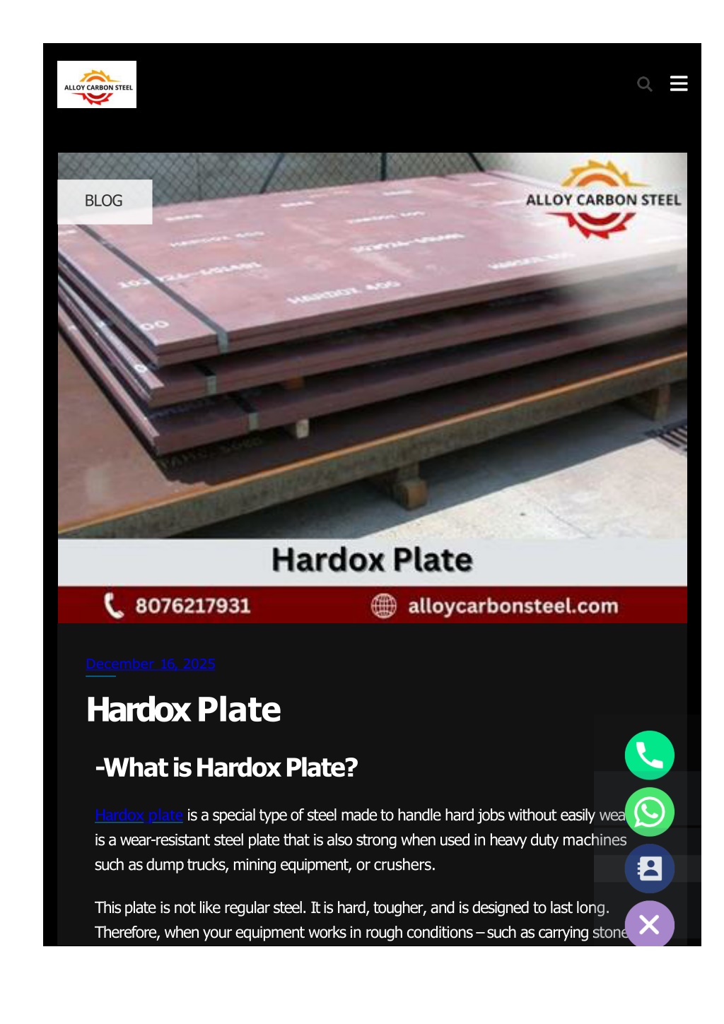 Hardox Plate by Alloy Carbon Steel is trusted for strength and durability. It handles rough conditions and reduces wear. Best for machinery, mining, and industrial applications. Get quality steel today. Order your Hardox Plate today. You also contact on this number 8076217931 and read here about us more: https://www.alloycarbonsteel.com/hardox-plate/