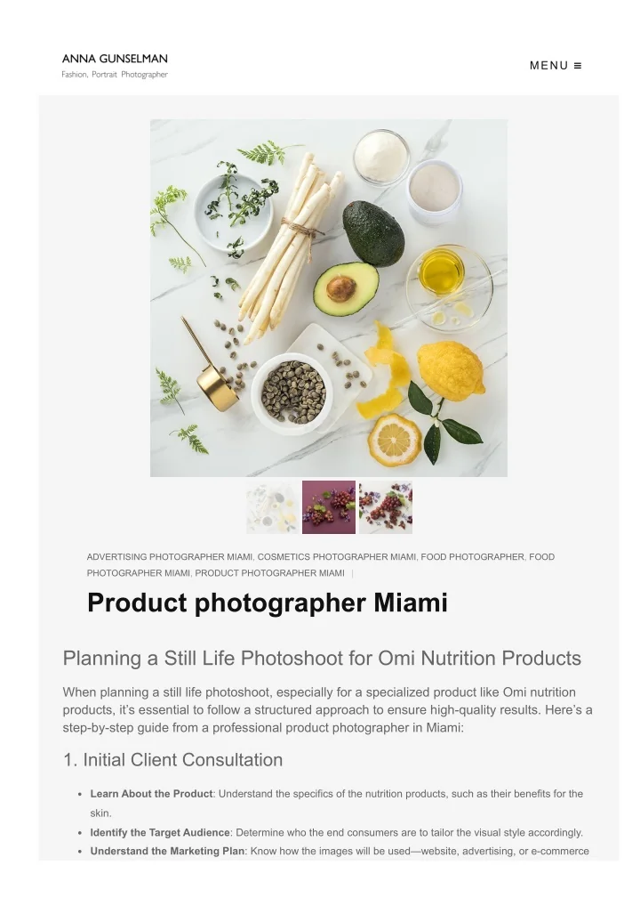 MENU ADVERTISING PHOTOGRAPHER MIAMI, COSMETICS PHOTOGRAPHER MIAMI, FOOD PHOTOGRAPHER, FOOD PHOTOGRAPHER MIAMI, PRODUCT PHOTOGRAPHER MIAMI | Product photographer Miami Planning a Still Life Photoshoot for Omi Nutrition Products When planning a still life photoshoot, especially for a specialized product like Omi nutrition products, it’s essential to follow a structured approach to ensure high-quality results. Here’s a step-by-step guide from a professional product photographer in Miami: 1. Initial Client Consultation Learn About the Product: Understand the specifics of the nutrition products, such as their benefits for the skin. Identify the Target Audience: Determine who the end consumers are to tailor the visual style accordingly. Understand the Marketing Plan: Know how the images will be used—website, advertising, or e-commerce