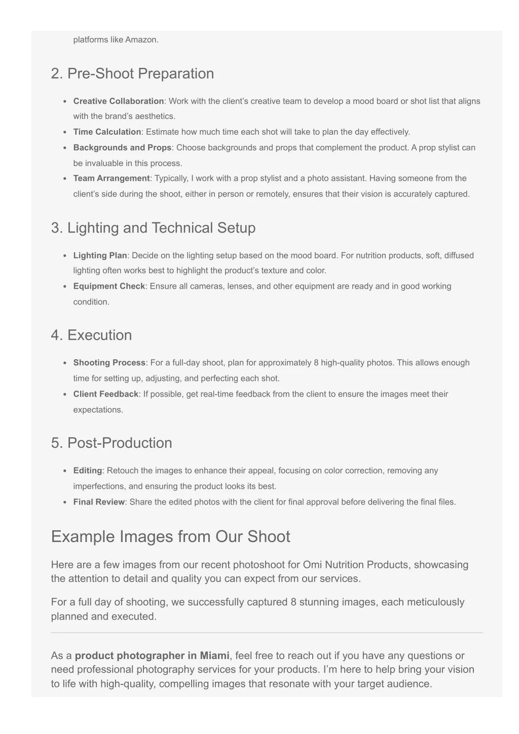 platforms like Amazon. 2. Pre-Shoot Preparation Creative Collaboration: Work with the client’s creative team to develop a mood board or shot list that aligns with the brand’s aesthetics. Time Calculation: Estimate how much time each shot will take to plan the day effectively. Backgrounds and Props: Choose backgrounds and props that complement the product. A prop stylist can be invaluable in this process. Team Arrangement: Typically, I work with a prop stylist and a photo assistant. Having someone from the client’s side during the shoot, either in person or remotely, ensures that their vision is accurately captured. 3. Lighting and Technical Setup Lighting Plan: Decide on the lighting setup based on the mood board. For nutrition products, soft, diffused lighting often works best to highlight the product’s texture and color. Equipment Check: Ensure all cameras, lenses, and other equipment are ready and in good working condition. 4. Execution Shooting Process: For a full-day shoot, plan for approximately 8 high-quality photos. This allows enough time for setting up, adjusting, and perfecting each shot. Client Feedback: If possible, get real-time feedback from the client to ensure the images meet their expectations. 5. Post-Production Editing: Retouch the images to enhance their appeal, focusing on color correction, removing any imperfections, and ensuring the product looks its best. Final Review: Share the edited photos with the client for final approval before delivering the final files. Example Images from Our Shoot Here are a few images from our recent photoshoot for Omi Nutrition Products, showcasing the attention to detail and quality you can expect from our services. For a full day of shooting, we successfully captured 8 stunning images, each meticulously planned and executed. As a product photographer in Miami, feel free to reach out if you have any questions or need professional photography services for your products. I’m here to help bring your vision to life with high-quality, compelling images that resonate with your target audience.
