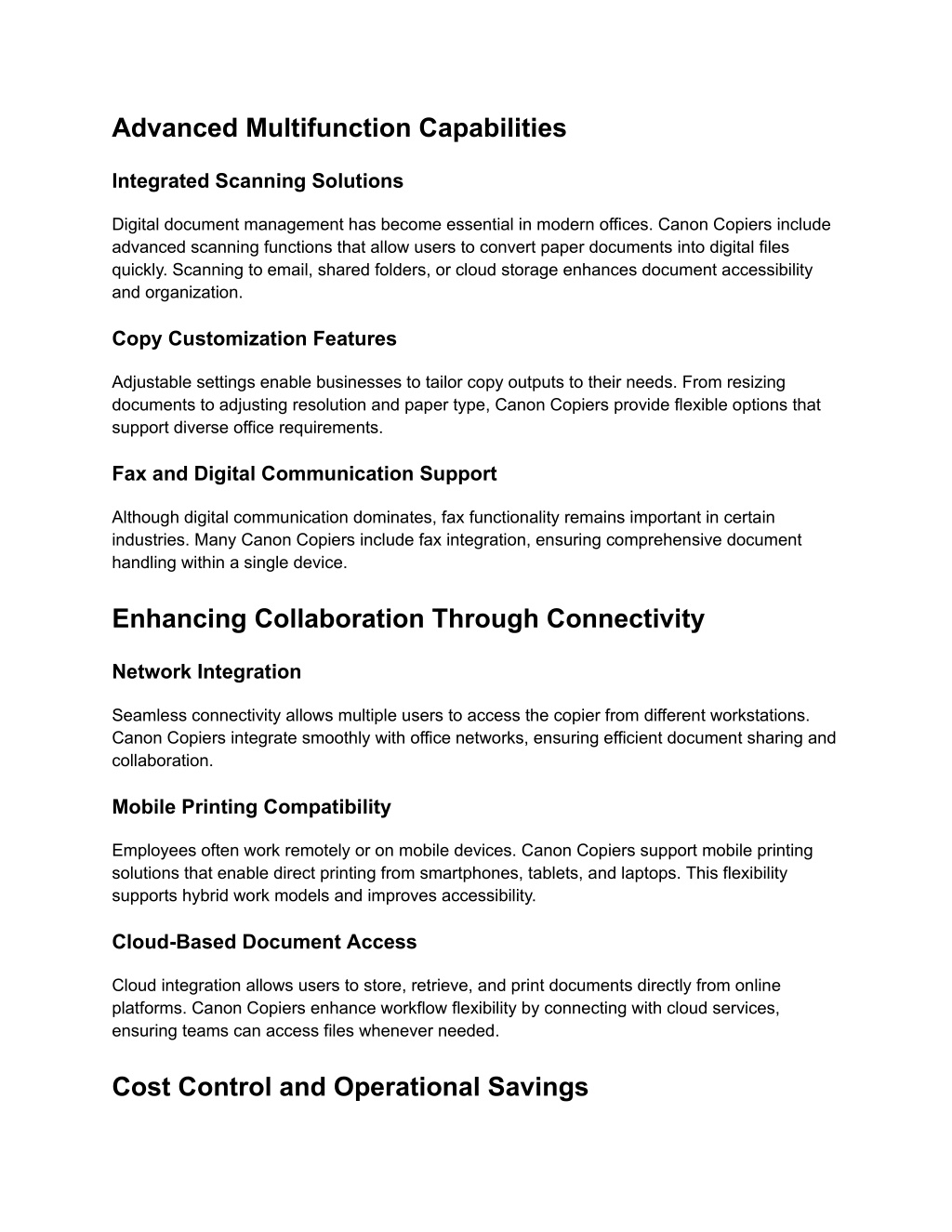 Advanced Multifunction Capabilities Integrated Scanning Solutions Digital document management has become essential in modern offices. Canon Copiers include advanced scanning functions that allow users to convert paper documents into digital files quickly. Scanning to email, shared folders, or cloud storage enhances document accessibility and organization. Copy Customization Features Adjustable settings enable businesses to tailor copy outputs to their needs. From resizing documents to adjusting resolution and paper type, Canon Copiers provide flexible options that support diverse office requirements. Fax and Digital Communication Support Although digital communication dominates, fax functionality remains important in certain industries. Many Canon Copiers include fax integration, ensuring comprehensive document handling within a single device. Enhancing Collaboration Through Connectivity Network Integration Seamless connectivity allows multiple users to access the copier from different workstations. Canon Copiers integrate smoothly with office networks, ensuring efficient document sharing and collaboration. Mobile Printing Compatibility Employees often work remotely or on mobile devices. Canon Copiers support mobile printing solutions that enable direct printing from smartphones, tablets, and laptops. This flexibility supports hybrid work models and improves accessibility. Cloud-Based Document Access Cloud integration allows users to store, retrieve, and print documents directly from online platforms. Canon Copiers enhance workflow flexibility by connecting with cloud services, ensuring teams can access files whenever needed. Cost Control and Operational Savings