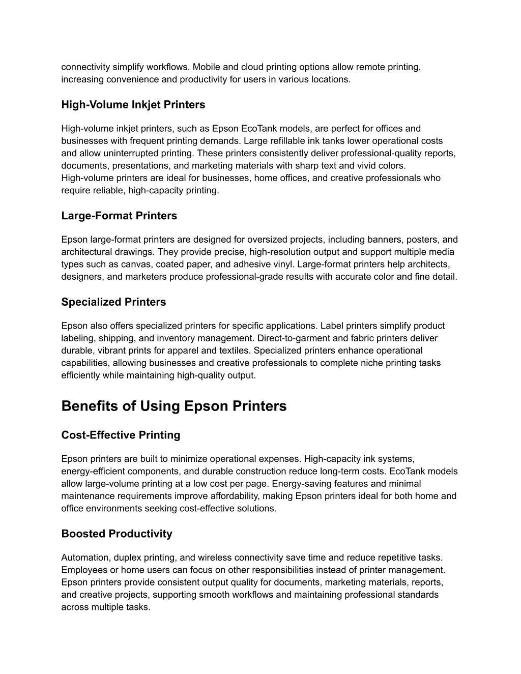 connectivity simplify workflows. Mobile and cloud printing options allow remote printing, increasing convenience and productivity for users in various locations. High-Volume Inkjet Printers High-volume inkjet printers, such as Epson EcoTank models, are perfect for offices and businesses with frequent printing demands. Large refillable ink tanks lower operational costs and allow uninterrupted printing. These printers consistently deliver professional-quality reports, documents, presentations, and marketing materials with sharp text and vivid colors. High-volume printers are ideal for businesses, home offices, and creative professionals who require reliable, high-capacity printing. Large-Format Printers Epson large-format printers are designed for oversized projects, including banners, posters, and architectural drawings. They provide precise, high-resolution output and support multiple media types such as canvas, coated paper, and adhesive vinyl. Large-format printers help architects, designers, and marketers produce professional-grade results with accurate color and fine detail. Specialized Printers Epson also offers specialized printers for specific applications. Label printers simplify product labeling, shipping, and inventory management. Direct-to-garment and fabric printers deliver durable, vibrant prints for apparel and textiles. Specialized printers enhance operational capabilities, allowing businesses and creative professionals to complete niche printing tasks efficiently while maintaining high-quality output. Benefits of Using Epson Printers Cost-Effective Printing Epson printers are built to minimize operational expenses. High-capacity ink systems, energy-efficient components, and durable construction reduce long-term costs. EcoTank models allow large-volume printing at a low cost per page. Energy-saving features and minimal maintenance requirements improve affordability, making Epson printers ideal for both home and office environments seeking cost-effective solutions. Boosted Productivity Automation, duplex printing, and wireless connectivity save time and reduce repetitive tasks. Employees or home users can focus on other responsibilities instead of printer management. Epson printers provide consistent output quality for documents, marketing materials, reports, and creative projects, supporting smooth workflows and maintaining professional standards across multiple tasks.