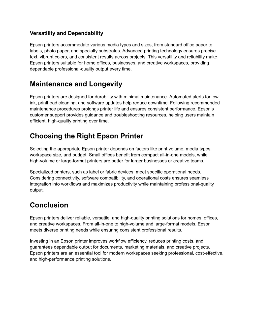 Versatility and Dependability Epson printers accommodate various media types and sizes, from standard office paper to labels, photo paper, and specialty substrates. Advanced printing technology ensures precise text, vibrant colors, and consistent results across projects. This versatility and reliability make Epson printers suitable for home offices, businesses, and creative workspaces, providing dependable professional-quality output every time. Maintenance and Longevity Epson printers are designed for durability with minimal maintenance. Automated alerts for low ink, printhead cleaning, and software updates help reduce downtime. Following recommended maintenance procedures prolongs printer life and ensures consistent performance. Epson’s customer support provides guidance and troubleshooting resources, helping users maintain efficient, high-quality printing over time. Choosing the Right Epson Printer Selecting the appropriate Epson printer depends on factors like print volume, media types, workspace size, and budget. Small offices benefit from compact all-in-one models, while high-volume or large-format printers are better for larger businesses or creative teams. Specialized printers, such as label or fabric devices, meet specific operational needs. Considering connectivity, software compatibility, and operational costs ensures seamless integration into workflows and maximizes productivity while maintaining professional-quality output. Conclusion Epson printers deliver reliable, versatile, and high-quality printing solutions for homes, offices, and creative workspaces. From all-in-one to high-volume and large-format models, Epson meets diverse printing needs while ensuring consistent professional results. Investing in an Epson printer improves workflow efficiency, reduces printing costs, and guarantees dependable output for documents, marketing materials, and creative projects. Epson printers are an essential tool for modern workspaces seeking professional, cost-effective, and high-performance printing solutions.